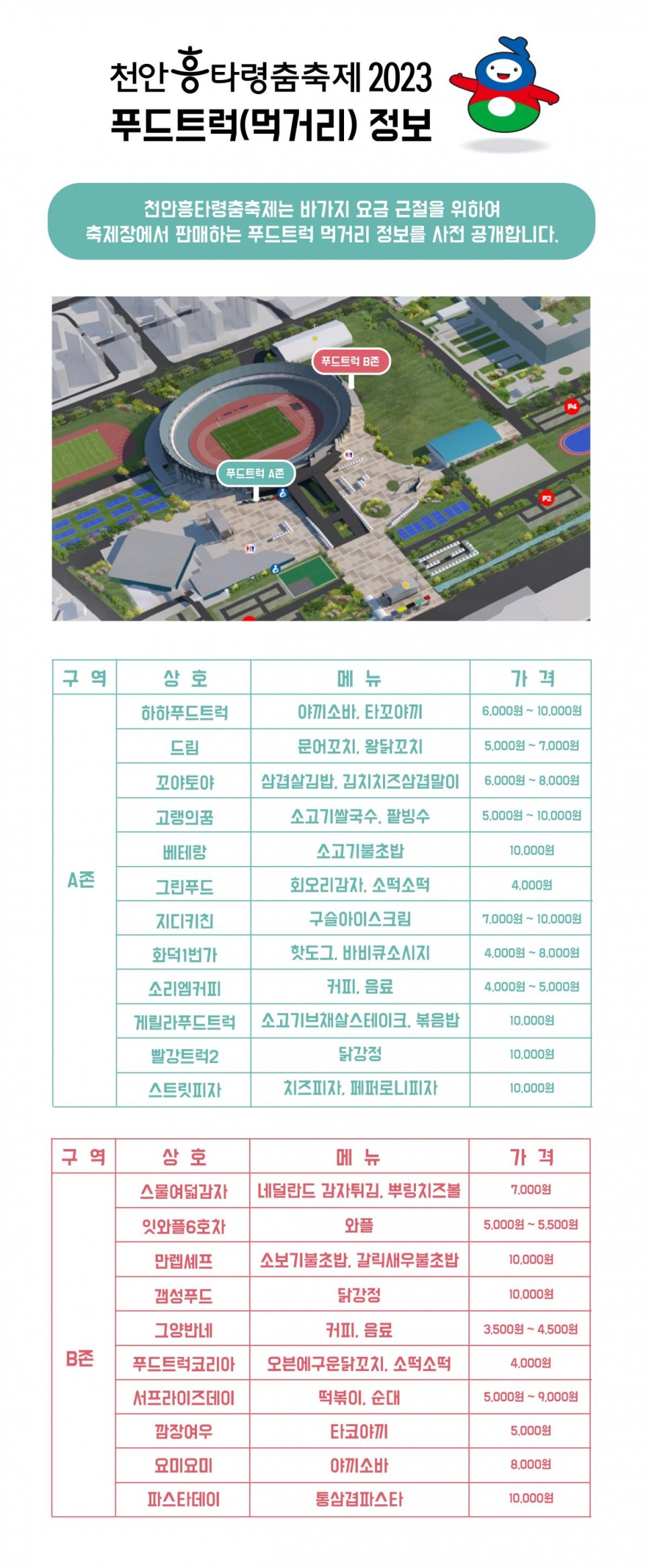천안흥타령축제는 바가지요금 근절을 위해 축제장에서 판매하는 푸드트럭 먹거리 정보를 사전에 공개한다고 하네요