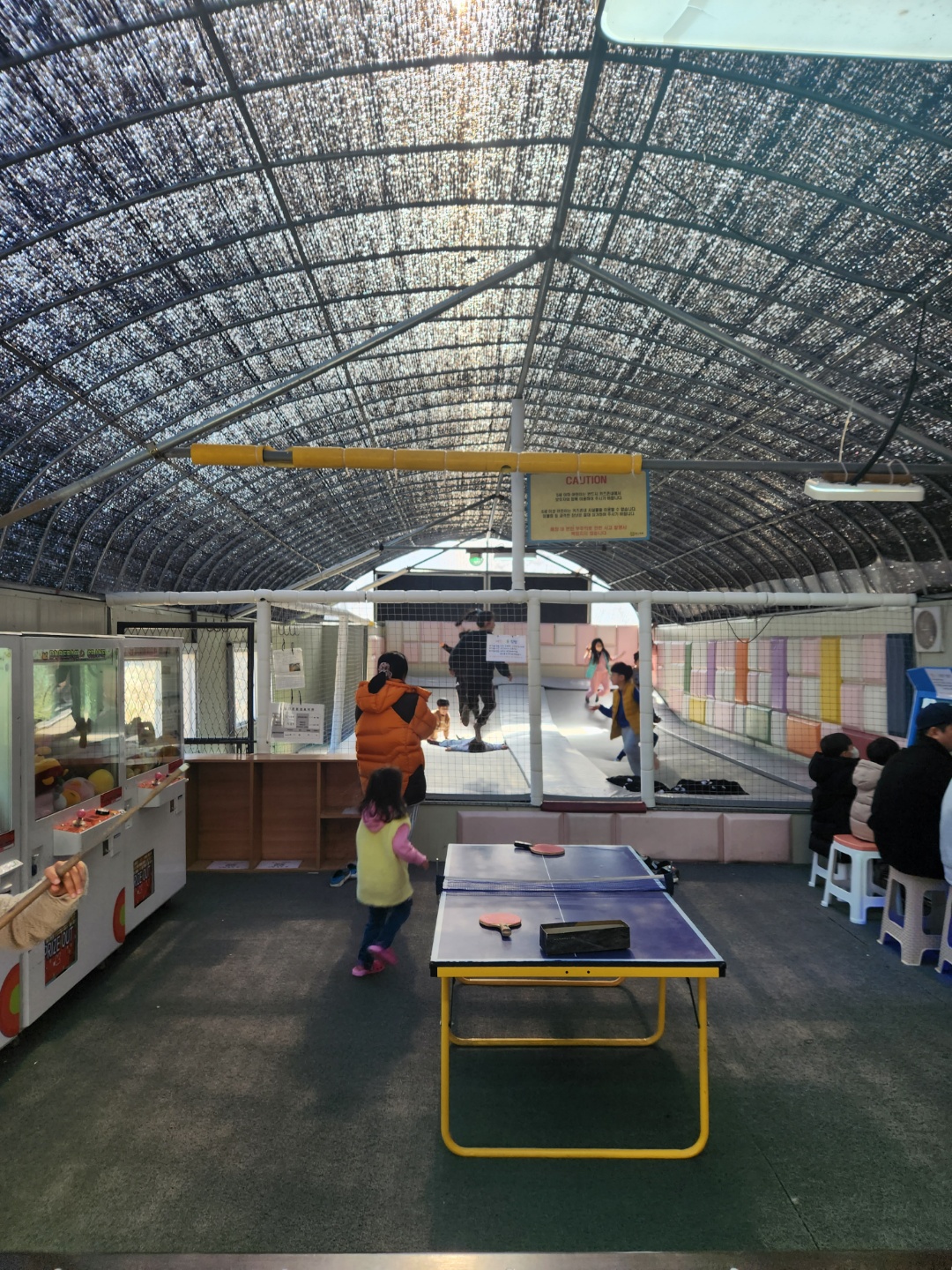 실내놀이터에는 트램펄린과 당구대, 오락기, 미니 농구대가 있었어요.