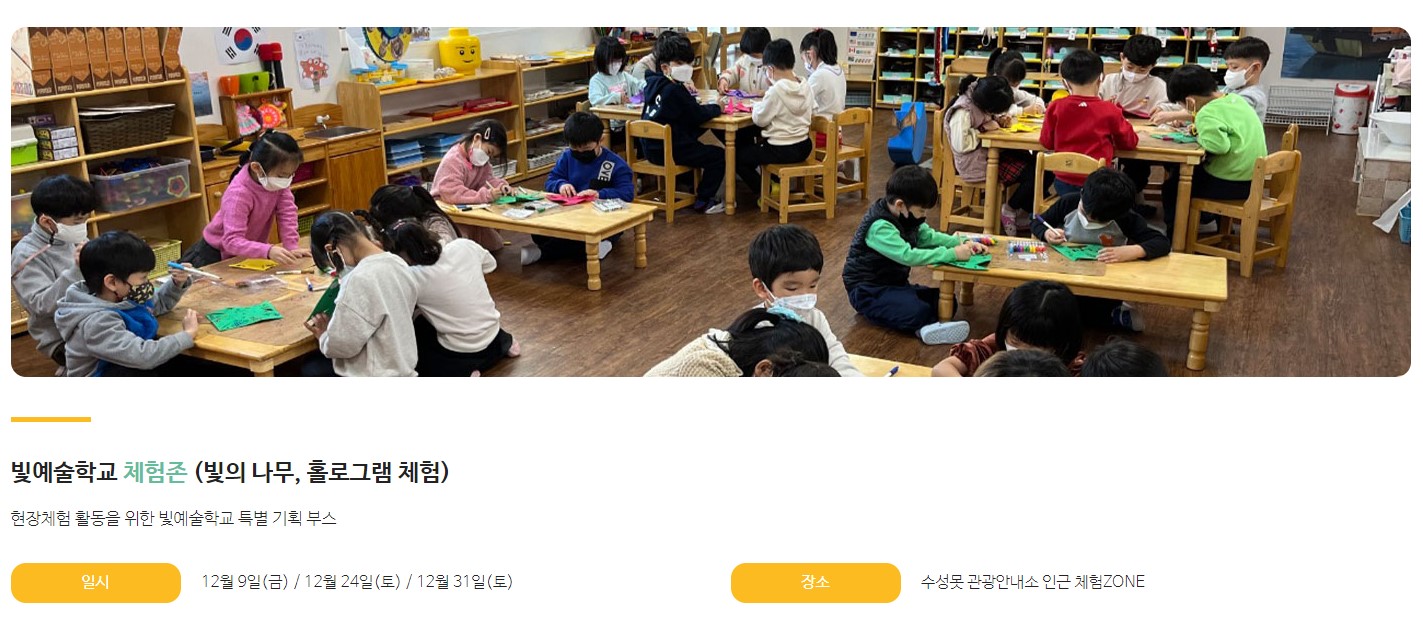 현장체험 활동을 위한 특별 기획 부스로 빛예술학교가 준비된다고하니 아이들과 같이 방문하시는 부모님들은 체험일정을 미리 알아보시고 참여하시면 아이들과 좋은 추억을 만드실수 있을거에요