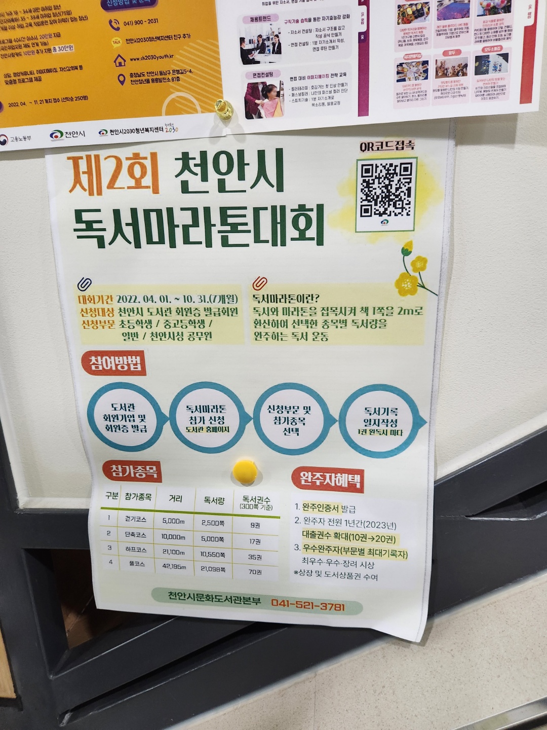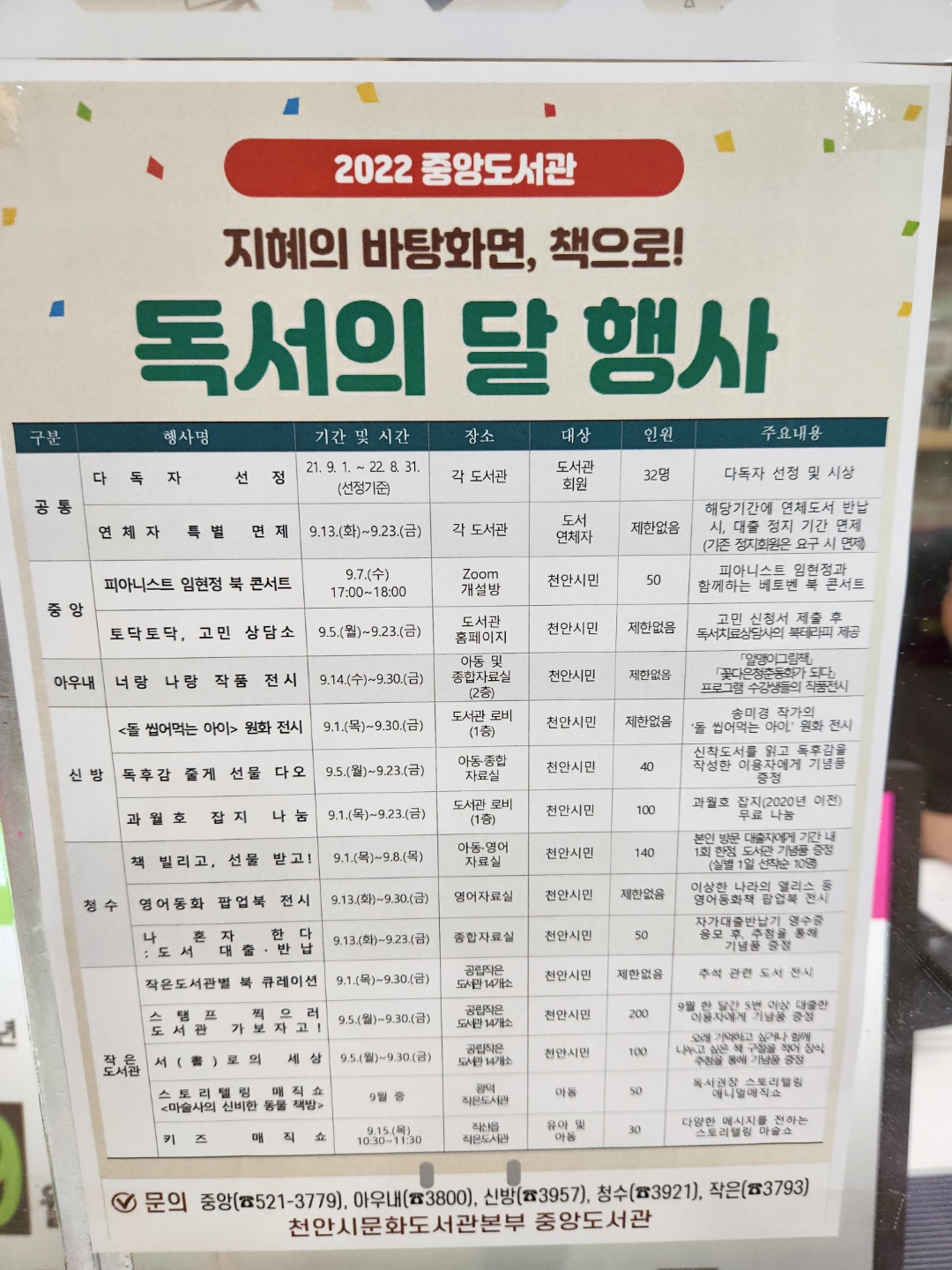 하나의 회원증으로 천안시 다른도서관(성거,아우내,도솔, 두정 등)도서관을 이용할 수 있다.