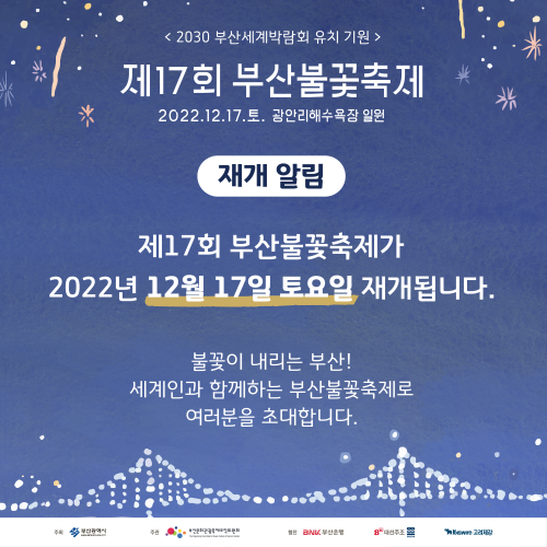 이번 제17회 부산불꽃축제는 2030 부산 세계박람회 유치를 기원하는 행사도 포함되어있어 더욱 성대하게 진행될 예정이니 꼭 참석하셔서 좋은 추억을 만드시길 바라요.