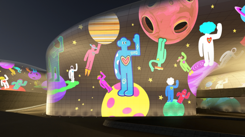 멀리 보이는 친구에게 손을 들어 흔드는 인사하는 여러 헬로맨들이 우주 먼 곳에서 여러 행성에 친구를 찾아 떠나고, 친구를 만나며, 이를 통해 심장이 뛰는 스토리를 초대형 미디어아트로 표현합니다.