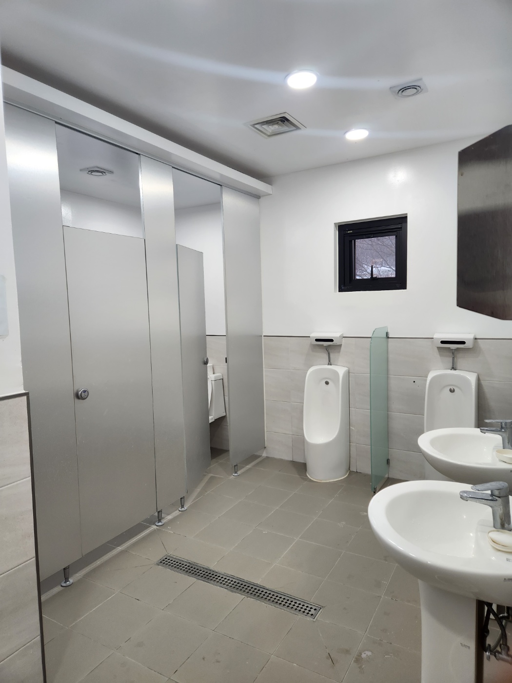 남자화장실 내부인데 특이하게 세면대도 2개가 설치되어있어 다른 분이 양치하거나 오래 사용할 경우에도 번거롭지 않게 손 씻기 등을 할 수 있었어요.