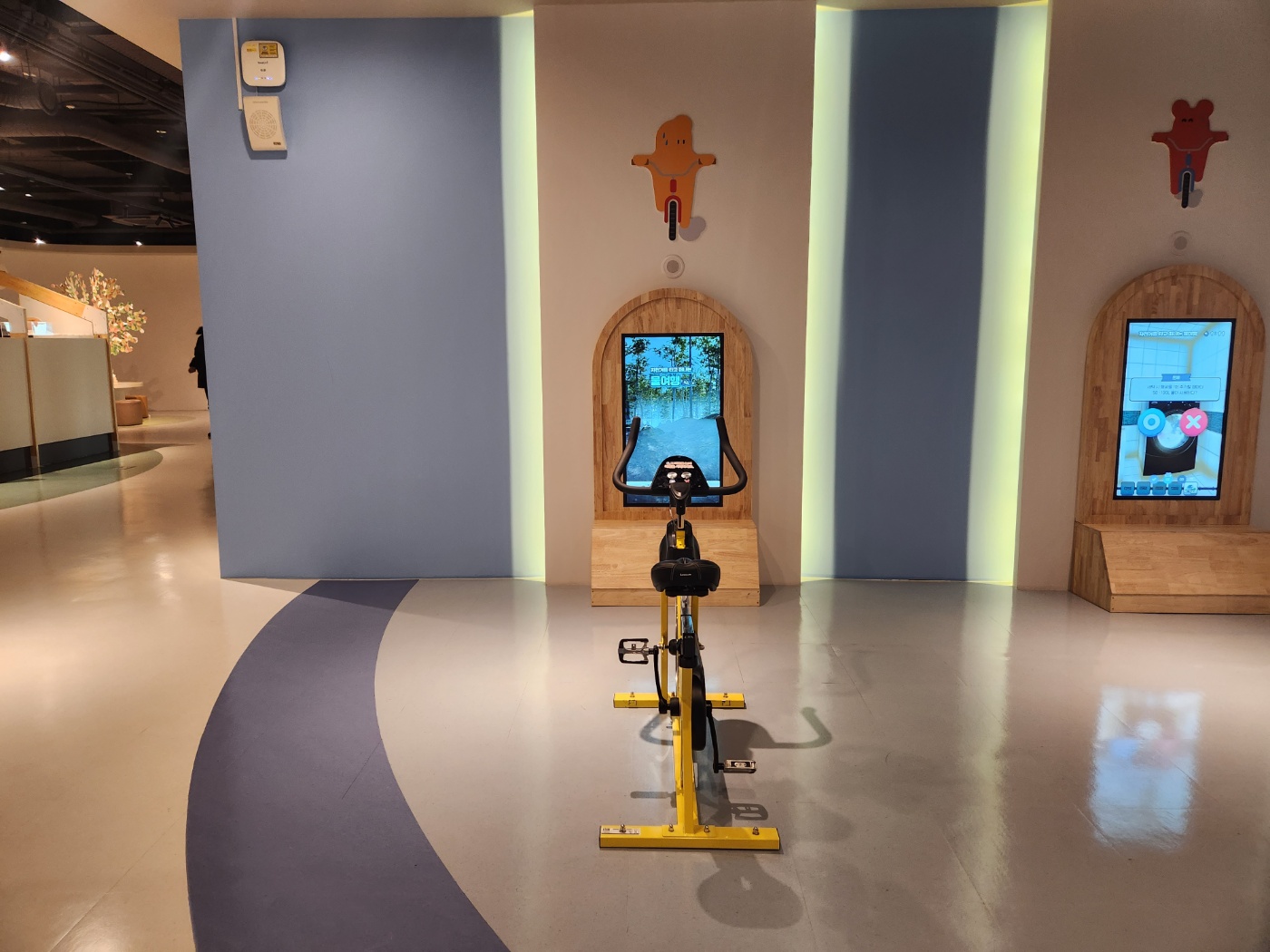 자전거를 타고 물방울을 따라가며 퀴즈를 푸는 체험 프로그램이에요