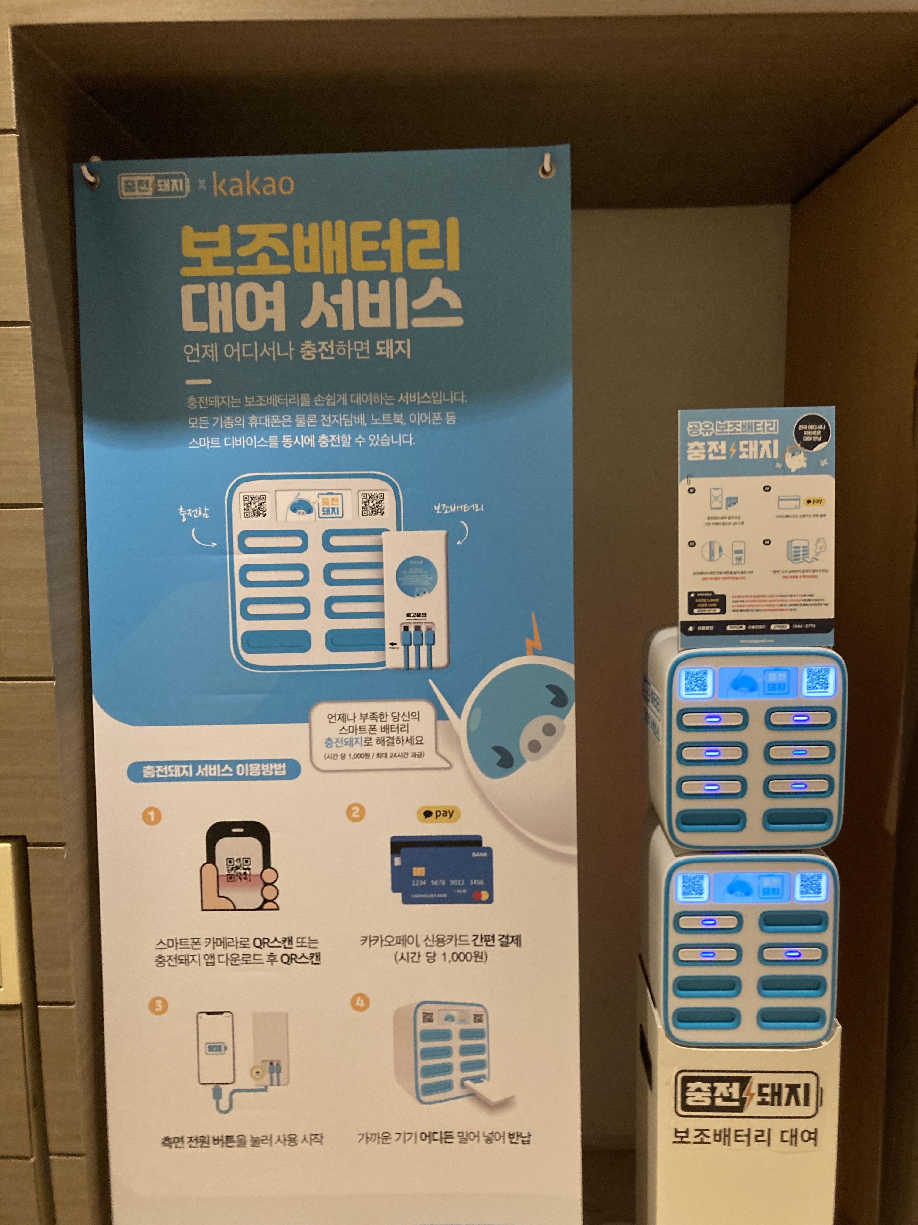 가장 눈에 띄었던 편의시설은 보조배터리 대여서비스인데 처음 보는 서비스의 형태로 신선하게 다가왔습니다.