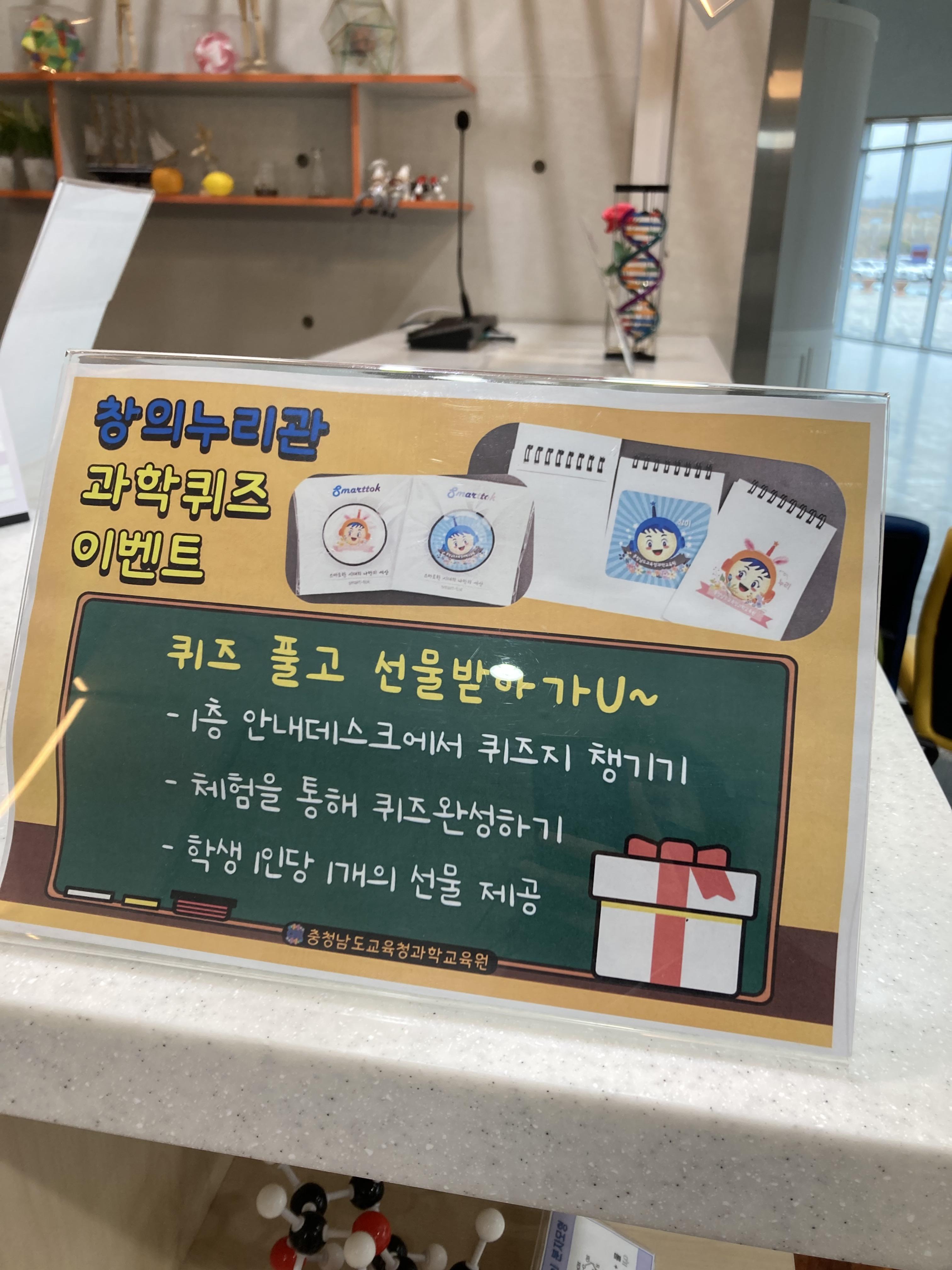 1층 안내데스크에 비치된 과학퀴즈투어 책자를 챙겨 퀴즈를 풀며 내부 관람을 하면 아이들이 관람에 더욱 집중할 수 있고 퀴즈를 모두 풀었을때 받는 선물로 성취감도 얻을 수 있을거같아요