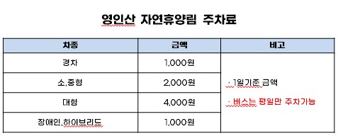 영인산 자연휴양림의 주차료는 경차부터 대형까지 금액이 다르고 버스의 경우 평일만 주차가 가능합니다.