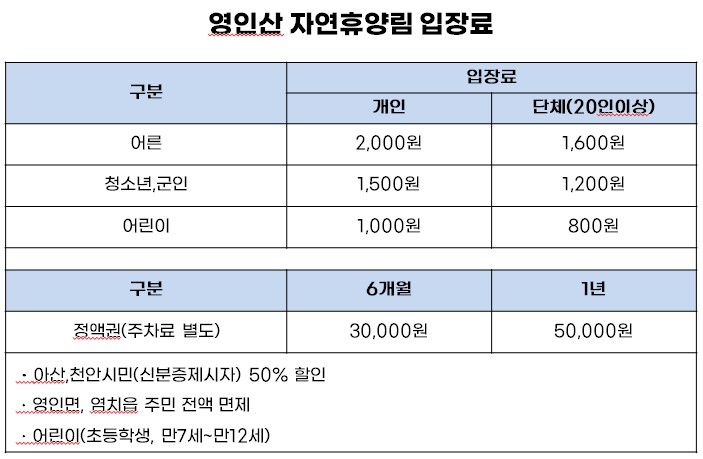 영인산 자연휴양림 입장료 지역주민 할인은 신분증을 지참하셔야 할인 받으실 수 있어요