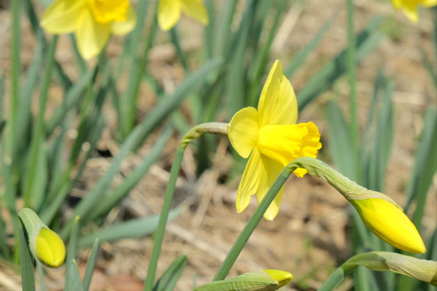 왼쪽에 보시면 초록색 부분이 보이시나요? 저 부분은 아직 피지 않은 수선화들이에요