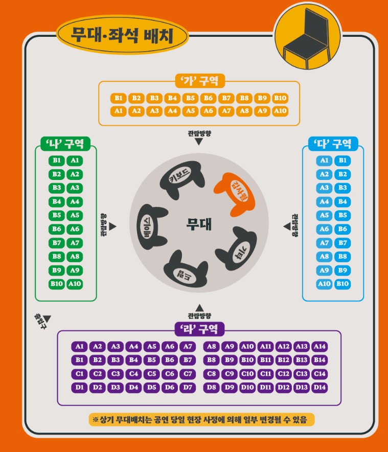세종음악창작소 공연장은 4면 객석으로 구성된 원형무대이며 무대와의 거리가 불과 1미터밖에 되지 않아 가까운 거리에서 뮤지션을 볼 수 있다는 장점과 관객수가 100명으로 한정되어 공연이라기보다는 팬미팅형식의 느낌일 것 같다.